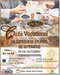 A Paróquia Santo Antônio, de Manoel Ribas, promove, no próximo sábado, 25 de outubro, o Café Vocacional da Catequese, um evento solidário em benefício do Seminário do Noviciado dos Padres Marianos, localizado naquele município.