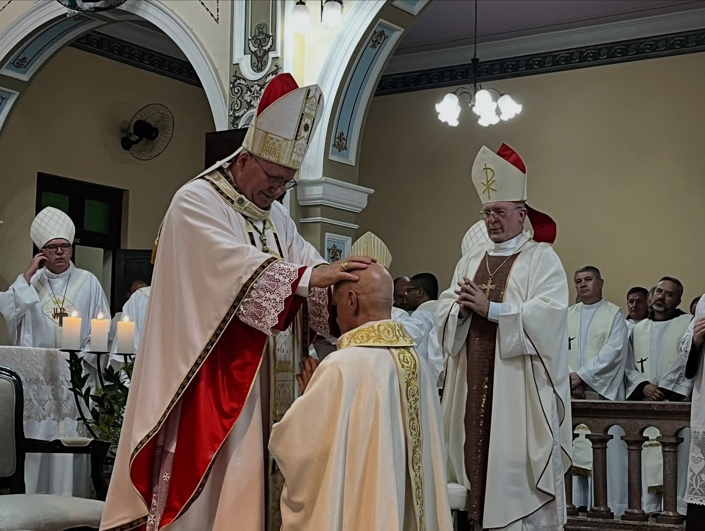 Em seguida, ocorreu o momento central da celebração: a imposição das mãos dos bispos e a oração consecratória, pela qual é invocado o Espírito Santo sobre o eleito. O rito prosseguiu com a unção da cabeça com o santo crisma e a entrega dos símbolos episcopais: Evangelho, sinal do anúncio da Palavra de Deus; o anel episcopal, expressão de fidelidade à Igreja; a mitra, símbolo da santidade; e o báculo, sinal do serviço pastoral e do cuidado com o povo de Deus. Por fim, o novo bispo foi conduzido ao presbitério, junto aos demais bispos, como um gesto de acolhida no colégio episcopal.