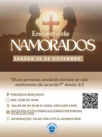 A Paróquia Bom Jesus, em Guarapuava, realizará no sábado, 8 de novembro de 2025, o Encontro de Namorados, das 13h às 18h, reunindo casais de namorados para uma tarde de reflexão, espiritualidade e convivência fraterna. Inspirado na passagem bíblica “Duas pessoas andarão juntas, se não estiverem de acordo?” (Am 3,3), o encontro propõe um olhar cristão sobre o namoro e o amor à luz da fé.