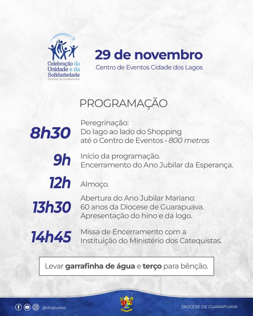 O coração da Diocese de Guarapuava já bate mais forte para o próximo sábado, 29 de novembro, quando vamos nos reunir para a Celebração da Unidade e da Solidariedade. Este grande encontro diocesano, que sempre marcou nosso calendário, ganha neste ano um sentido ainda mais profundo — nascido da dor compartilhada e da fé que nunca nos abandona, após os fortes tornados que atingiram nossa região no dia 7 deste mês — afetando comunidades rurais de Guarapuava, Turvo e provocando estragos severos em Rio Bonito do Iguaçu.