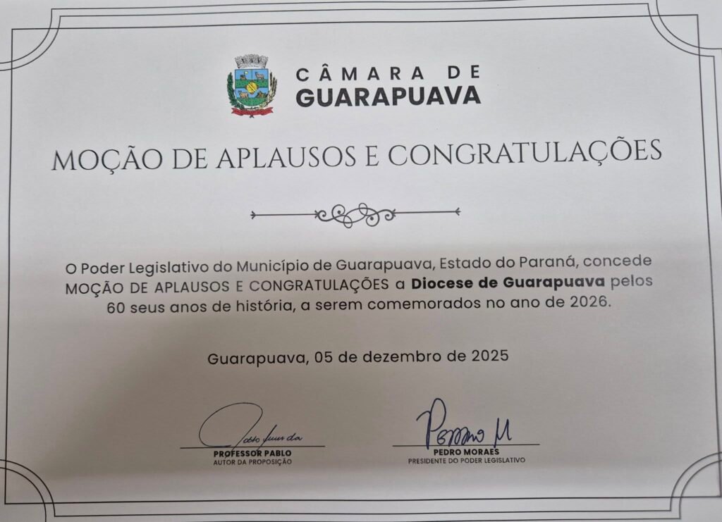 A Câmara Municipal de Guarapuava prestou, nesta segunda-feira, 24 de novembro, uma homenagem especial à Diocese de Guarapuava, que completa 60 anos de instalação em 2026. A Casa Legislativa aprovou por unanimidade uma Moção de Aplausos e Congratulações, proposta pelo vereador Professor Pablo Almeida, em reconhecimento à presença histórica, pastoral e social da Diocese no desenvolvimento do município e de toda a região.