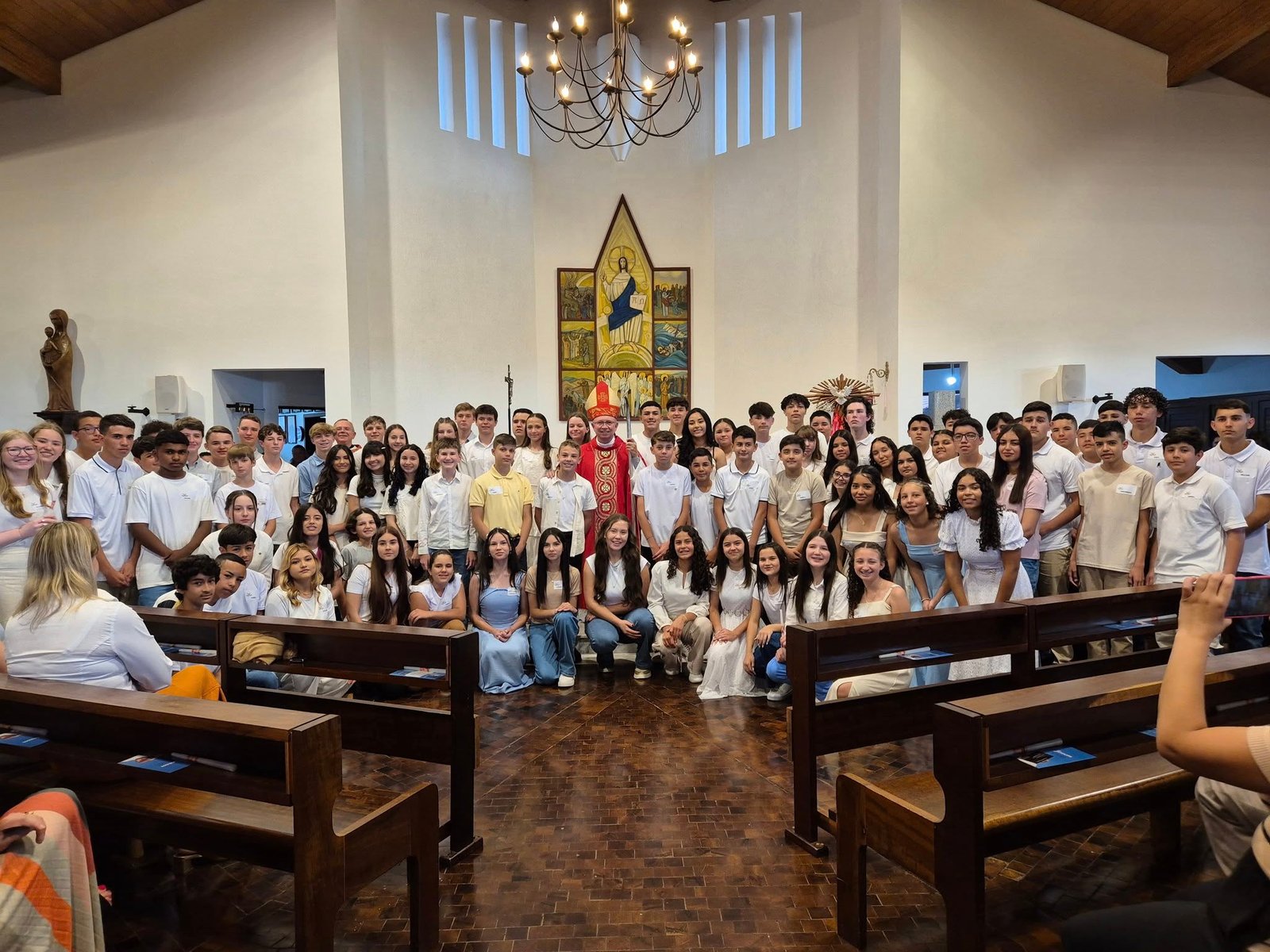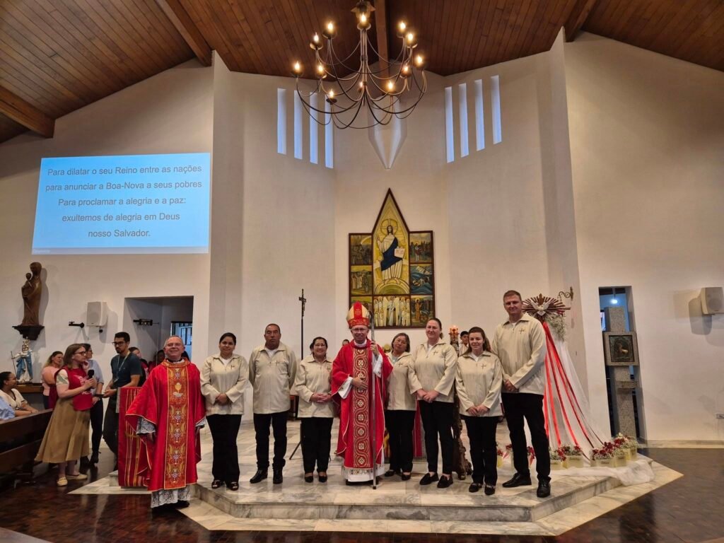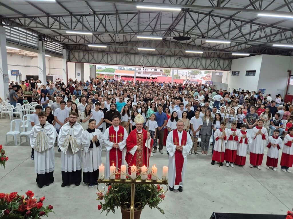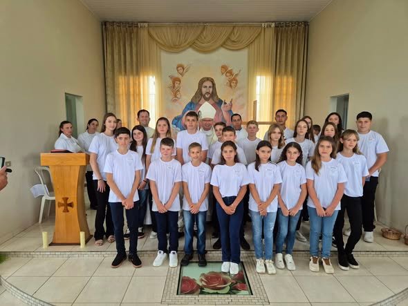 O domingo, 16 de novembro, também foi marcado por forte presença pastoral. Pela manhã, Dom Amilton esteve na Paróquia São Miguel Arcanjo, no Distrito de Entre Rios, onde conferiu o sacramento da Crisma e presidiu a celebração que instituiu novos Ministros da Esperança.