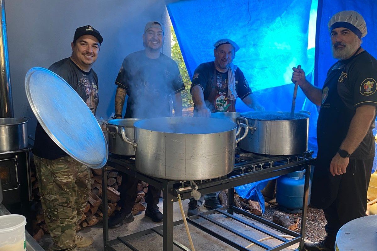 Desde o sábado, 8 de novembro, o movimento “Homens de Fé”, de Guarapuava, organiza diariamente a produção e distribuição de cerca de 700 marmitas destinadas aos voluntários e equipes de trabalho que atuam no atendimento às famílias atingidas.