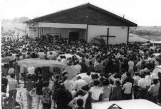 Ainda em 1969, surgiu a necessidade de um espaço próprio para as celebrações. Laurindo Rocha doou um terreno onde seria construída a futura capela. No local, no dia 12 de outubro, foi celebrada a primeira missa a céu aberto. Os anos seguintes foram marcados por intenso trabalho comunitário, com festas e ações para arrecadação de recursos, possibilitando a construção da primeira capela.