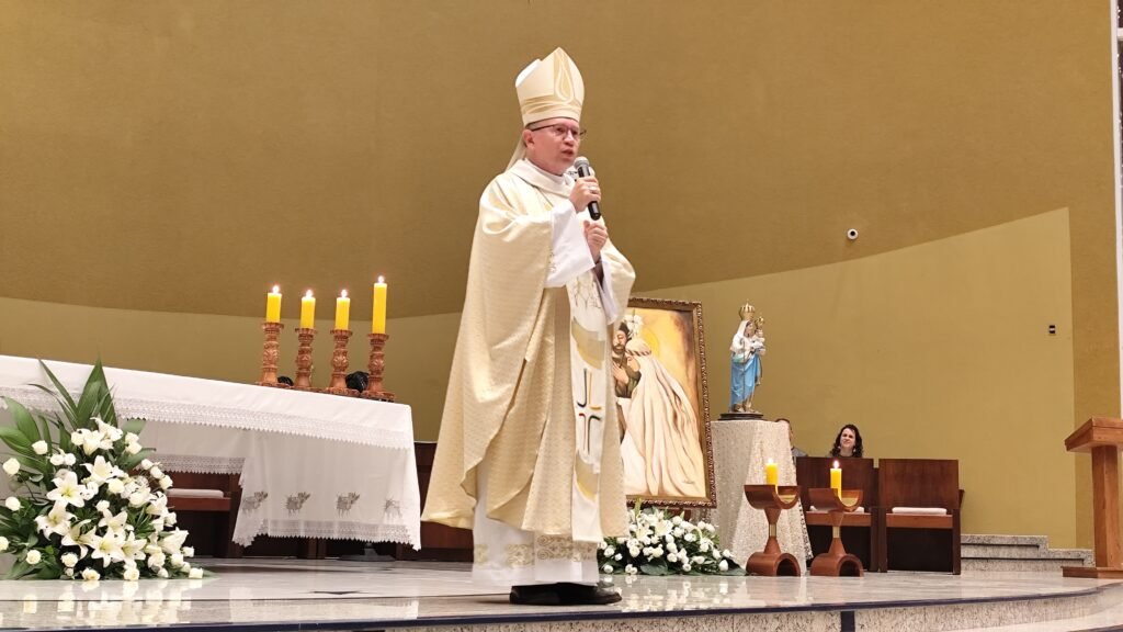 Pela primeira vez, a Catedral Nossa Senhora de Belém acolheu, na noite desta quinta-feira, 22 de janeiro, a Santa Missa dos Santos Esposos, inspirada no testemunho de amor, fidelidade e obediência a Deus de Maria e José. A celebração integrou a programação que antecede a novena em honra à padroeira da Diocese de Guarapuava e foi presidida pelo bispo diocesano, Dom Amilton Manoel da Silva.