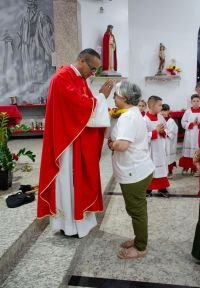A celebração foi presidida pelo padre Mateus e destacou a fé do povo na intercessão de São Brás, especialmente no cuidado com a saúde. Durante a liturgia, aconteceu a tradicional bênção da garganta, um gesto simples e antigo na tradição da Igreja, no qual os fiéis pedem a proteção do santo contra as enfermidades, confiando a Deus suas intenções e necessidades.