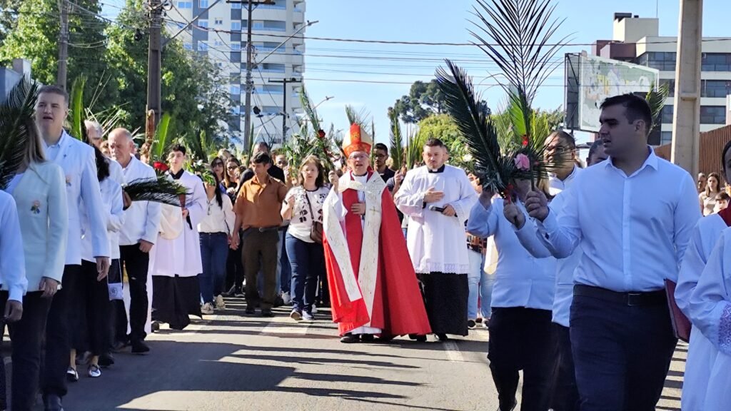A Igreja Católica celebra neste domingo, 29 de março, o Domingo de Ramos, dando início à Semana Santa, o tempo mais importante do calendário litúrgico. Em Guarapuava, uma das celebrações foi presidida pelo bispo diocesano, Dom Amilton Manoel da Silva, com início em frente ao Hospital São Vicente e sequência na Catedral Nossa Senhora de Belém.