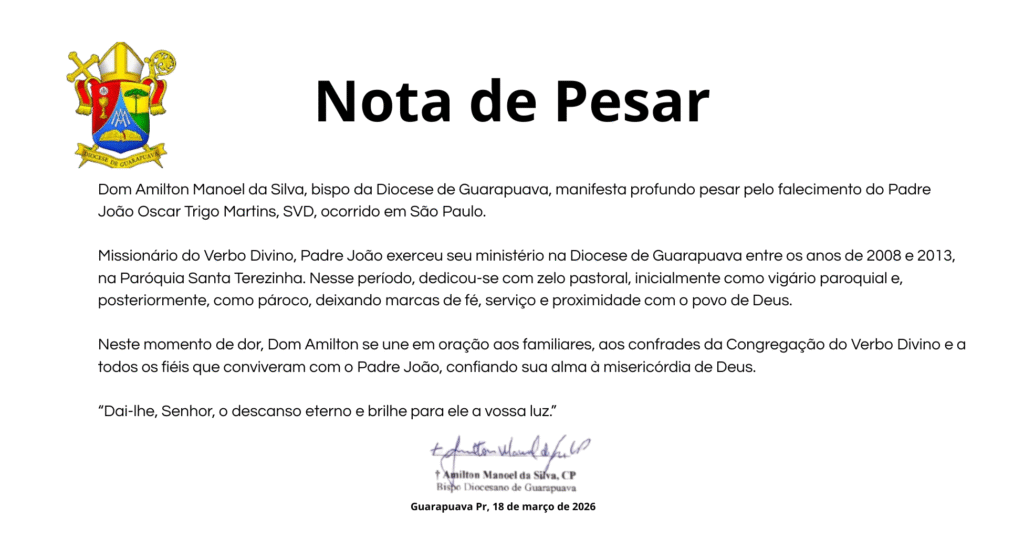 Em nota oficial, o bispo diocesano, Dom Amilton Manoel da Silva, destacou o testemunho de fé e serviço do sacerdote. “Padre João exerceu seu ministério na Diocese de Guarapuava entre os anos de 2008 e 2013, na Paróquia Santa Terezinha, dedicando-se com zelo pastoral e proximidade com o povo de Deus”, afirma o texto . Dom Amilton também se uniu em oração aos familiares, confrades e fiéis, confiando o sacerdote à misericórdia divina.