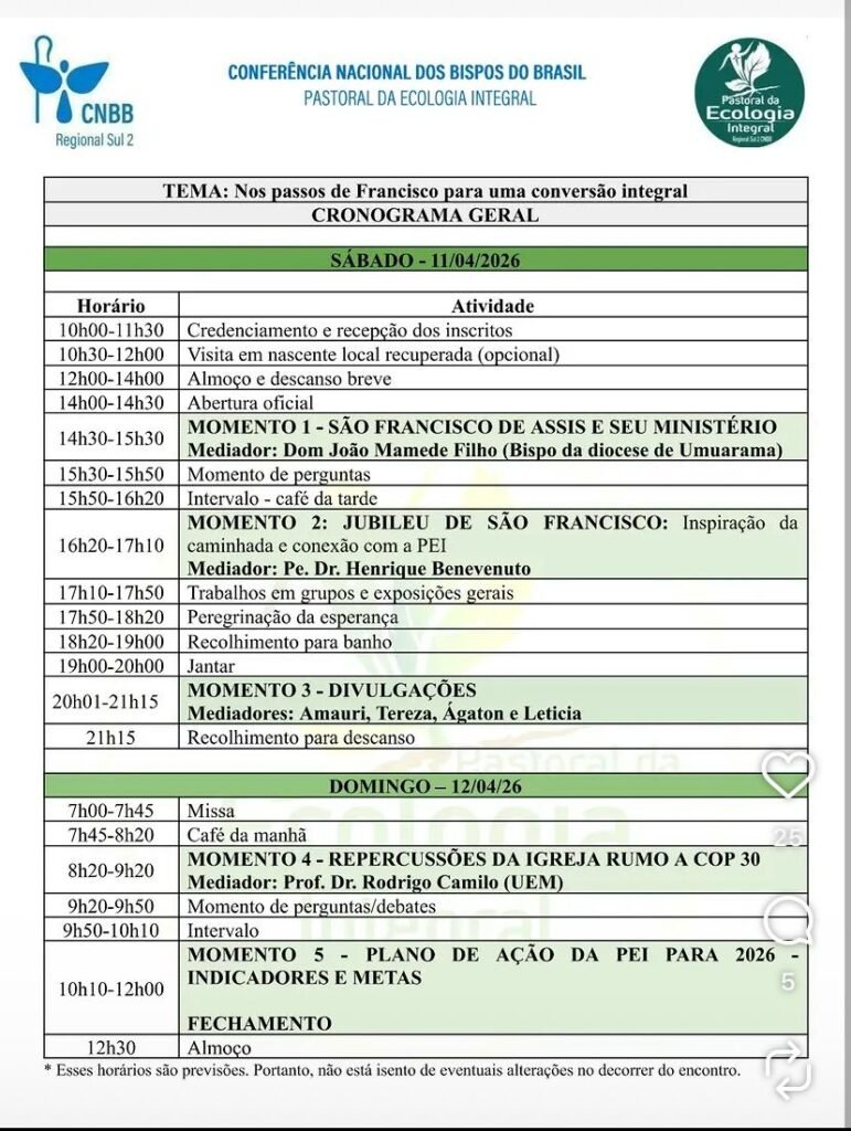 No domingo (12), as atividades iniciam às 7h com a celebração da Santa Missa, seguida de café da manhã. Às 8h20, acontece o quarto momento formativo, com o tema “Repercussões da Igreja rumo à COP 30”, mediado pelo professor doutor Rodrigo Camilo, da Universidade Estadual de Maringá (UEM). Em seguida, há espaço para perguntas e partilha entre os participantes, concluindo o encontro.
